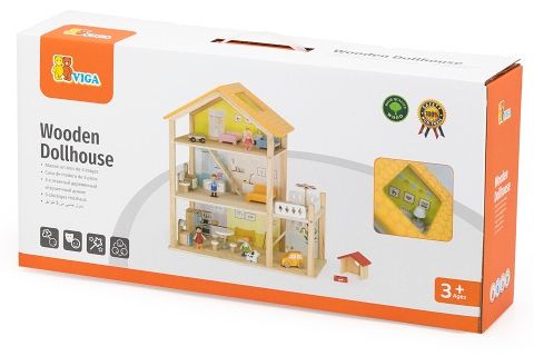 Dřevěný domeček s doplňky. Dispozičně domeček obsahuje garáž, kuchyň, obývací pokoj, ložnici s koupelnou a dětský pokoj. Balení obsahuje domeček o rozměrech 60x65,4x28,5 cm, 4 dřevěné panenky a 27 doplňků jako např. skříňky, postele, schody, slunečník nebo boudu pro pejska. Rozměry balení 61,5x30x15 cm. Věk 3+