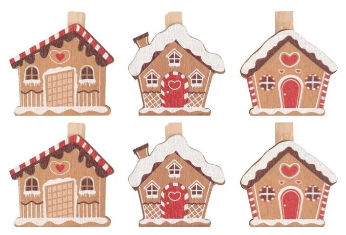 Dřevěné chaloupky na kolíčku Kolíčky využijete k různým dekoračním či aranžérským účelům. Můžete je použít k ozdobení věnců či vazeb, přáníček, obálek nebo dárků. 6 kusů v sáčku.