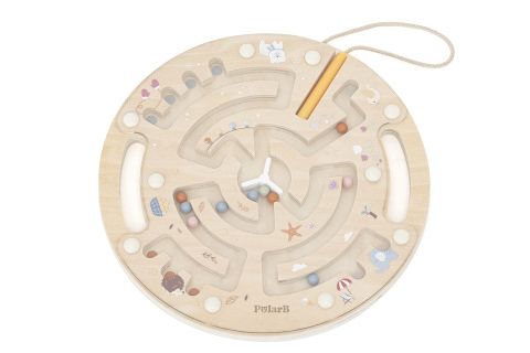 Dřevěná magnetická hra-labyrint. Pomocí magnetické tužky děti posouvají kuličky v labyrintu. Rozměry balení 26x26x4 cm. Věk 18m+