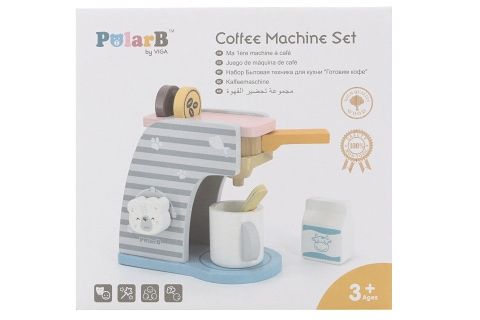 Dřevěný kávovar o velikosti cca 16,5 x 14,5 x 9 cm. Rozměry balení cca 17 x 16 x 9,5 cm. Věk 3+
