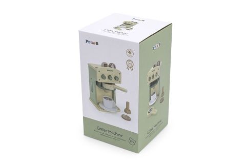 Dřevěný kávovar s příslušenstvím. Balení obsahuje kávovar, páku, hrneček, podšálek a 4 kolečka s obrázkem druhu kávy. Rozměry kávovaru 12,5x12,5x19,5 cm. Rozměry balení cca 13x13x23 cm. Věk 3+