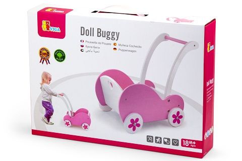 Dřevěný kočárek pro panenky o velikosti cca 48 x 43 x 30 cm. Věk 18m+
