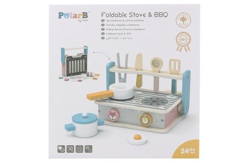 Dřevěný sporák a gril o velikosti cca 24,5 x 25 x 6,8 cm. Balení obsahuje také 8 kusů příslušenství. Rozměry balení cca 25,5 x 26 x 8 cm. Věk 24m+