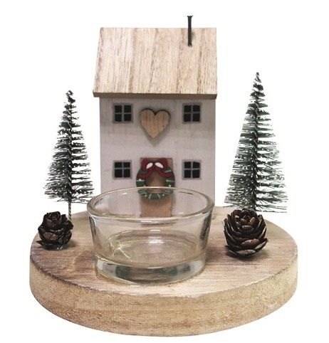 Dřevěná dekorace na svíčku s domečkem Vytvořte si kouzelnou vánoční atmosféru s dřevěnou dekorací s domečkem na svíčku. Doporučujeme používat s klasickou čajovou svíčkou. Vhodné jako dárek.
