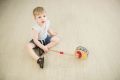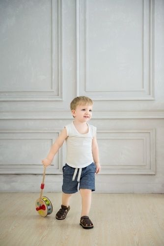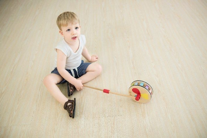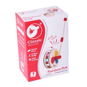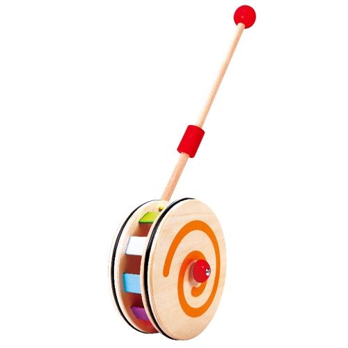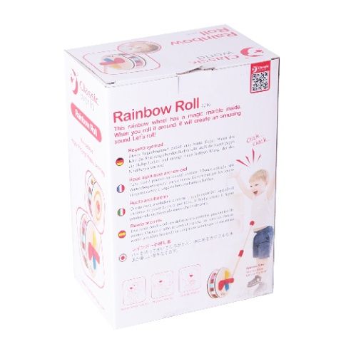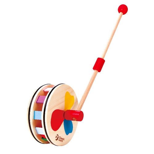 Hračka pro nejmenší v podobě strkadla s duhovým kolečkem s korálky uvnitř. Při jízdě se kolečko točí a díky korálkům uvnitř působí příjemný zvuk. Tím upoutá pozornost dítěte a stimuluje ho k dalšímu pohybu. Sestavení hračky musí provádět dospělá osoba.