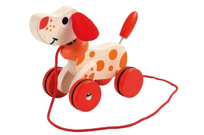 Dřevěný tahací pejsek na kolečkách, který se při jízdě vrtí.