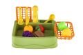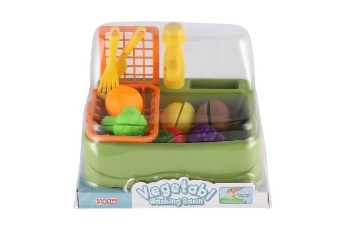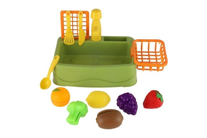 Dřez na mytí nádobí pro malé hospodyňky. Sada obsahuje krájecí ovoce a doplňky. Kohoutek na vodu je formou pumpičky.