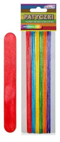 Dřevěné špachtle barevné. Velikost: 200 x 25 x 1,6 mm. V balení 25 ks.