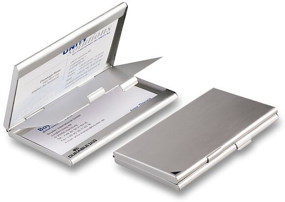 Elegantní zásobník na vizitky v matové stříbrné úpravě. Na 2 x 10 ks vizitek, 90 x 55 mm.