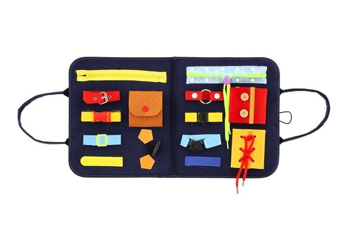Edukační penál filc zapínání a otevírání zipů a knoflíků v sáčku 24x27x4cm