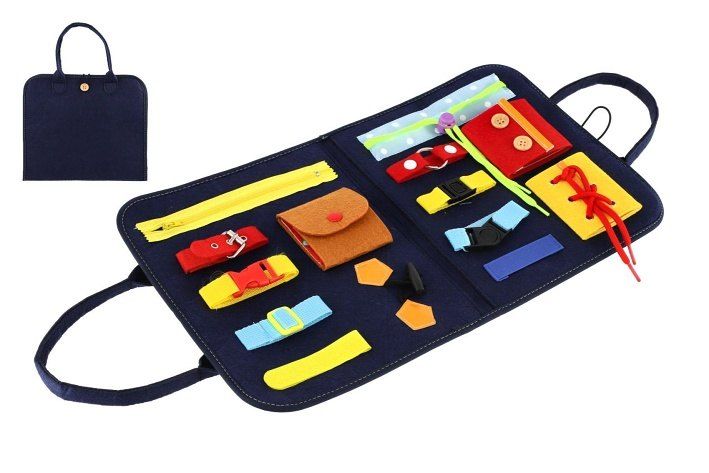 Edukační penál filc zapínání a otevírání zipů a knoflíků v sáčku 24x27x4cm