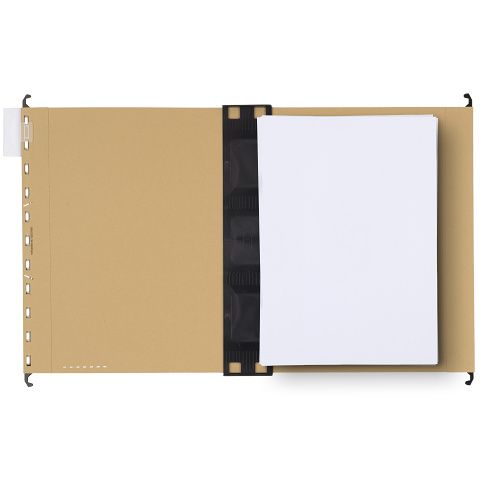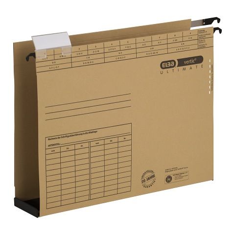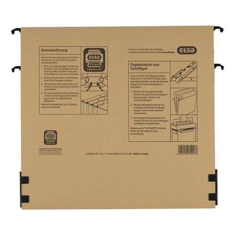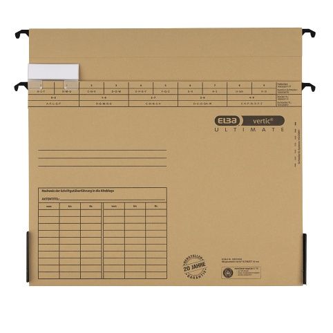 Hnědé, otevírání shora,60 milimetrový plastový spodek, s exkluzivním držákem štítků Elba komfort, složka pojme až 530 listů papíru, karton 240 g/m2, certifikát Blue Angel