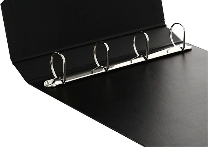 Černý, vnitřní polep v barvě pořadače, karton pokrytý PVC, hřbetní štítek, celobarevný, 4 kroužkový