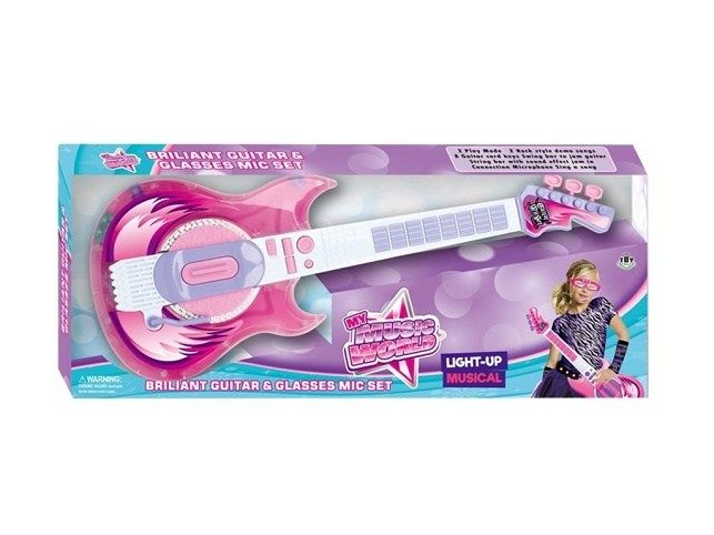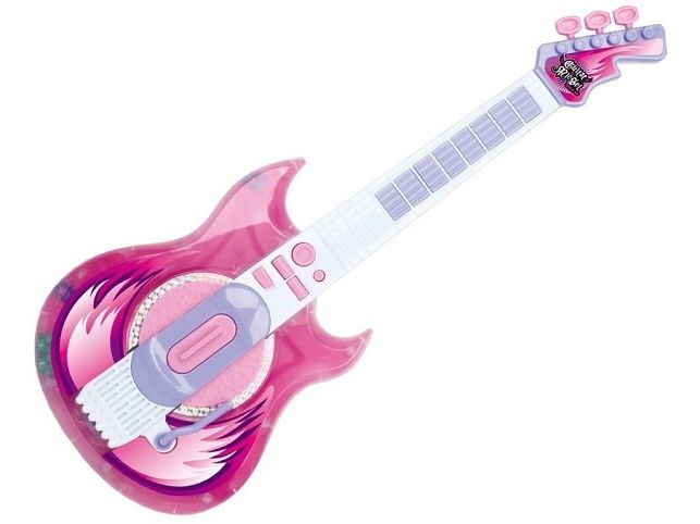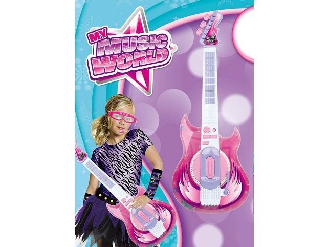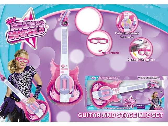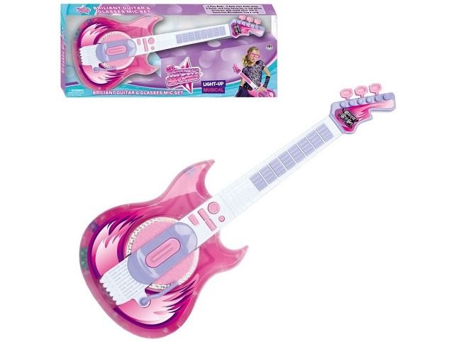 Elektrická kytara se "stage" mikrofonem a brýlemi, 55 cm. Krásná dívčí kytara rozvíjí hudební dovednosti. Má Vaše dítě rádo hudební nástroje, kytaru a zpěv? Pak je kytara ideálním dárkem. Dětská kytara má i brýle s mikrofonem pro lepší zábavu. Rozměr boxu: 23 x 5 x 59 cmMateriál hračky je plast. Doporučený věk: 3 +