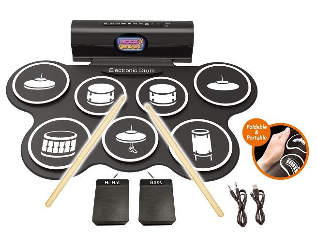 Elektronická bicí souprava s 2 pedály. Rozměry 44x32x6 cm. Světelné a zvukové efekty. 3xAA baterie součástí. Obsahuje 7 elektronických bubnů, 2 chodidlové pedály (hit-hat, bass), 2 dřevěné paličky, kabel na připojení mobilu/mp3 přehrávače, USB kabel, návod. Funkce - 7 realistických zvuků bubnů (pop, rock, latin, electro, percussion), 12 demo skladeb (funk, latin, dance, samba, cha-cha, swing hi-hat, upbeat rock, heavy rock), 9 rytmů, nahrávání (až 1000 úderů) a přehrávání, nastavení tempa a hlasitosti, konektor na připojení mobilu/mp3 přehrávače.
