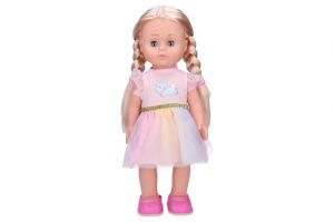 chodící a zpívající panenka, růžové šaty, výška 41 cm, písničky: travička zelená, kočka leze dírou, červený šátečku, prší prší, já do lesa nepojedu, holka modrooká, kalamajka