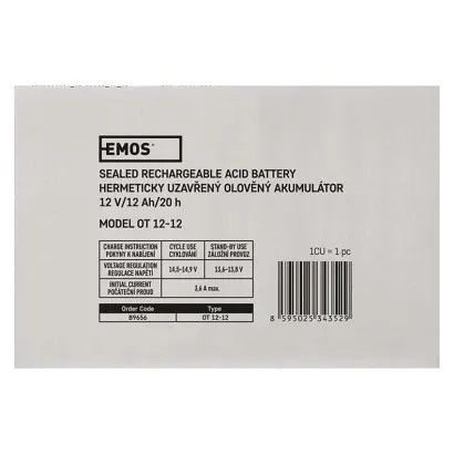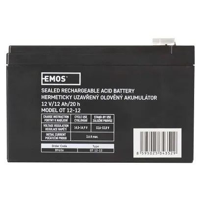 Akumulátor EMOS je vhodný jako náhradní baterie pro záložní zdroje UPS, RBC kity, elektronické systémy EZS, EPS, záložní systémy výtahů apod. Bezúdržbový, ventilem řízený olověný akumulátor v provedení AGM umožňuje být používán v libovolné poloze. Optimální životnost v záložních systémech je 5 let.Nabíjení baterie musí být prováděno vhodným napájecím zdrojem nebo nabíječem, který má hodnotu nabíjecího napětí 14,4 V pro 12 V akumulátory a 7,2 V pro 6 V akumulátory. V případě, že nabíječ nebo napájecí zdroj nemá tyto parametry, tak dochází k neúplnému nabíjení a dochází k tomu, že akumulátor bude rychle spotřebován a v krajním případě zničen. V tomto případě nelze uznat reklamaci akumulátoru.