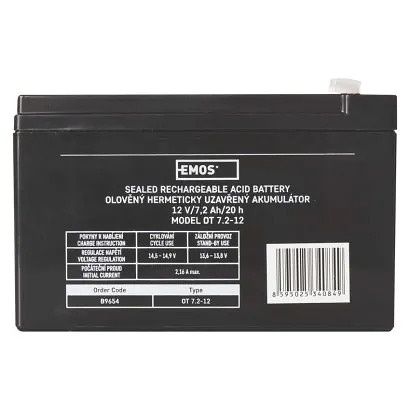 Akumulátor EMOS je vhodný jako náhradní baterie pro elektronické systémy - EZS, EPS (ústředny Jablotron a Paradox), záložní systémy výtahů, dětské vozítka apod. Bezúdržbový, ventilem řízený olověný akumulátor v provedení AGM umožňuje být používán v libovolné poloze. Optimální životnost v záložních systémech je 5 let.Nabíjení baterie musí být prováděno vhodným napájecím zdrojem nebo nabíječem, který má hodnotu nabíjecího napětí 14,4 V pro 12 V akumulátory a 7,2 V pro 6 V akumulátory. V případě, že nabíječ nebo napájecí zdroj nemá tyto parametry, tak dochází k neúplnému nabíjení a dochází k tomu, že akumulátor bude rychle spotřebován a v krajním případě zničen. V tomto případě nelze uznat reklamaci akumulátoru.