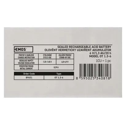 Akumulátor EMOS je vhodný jako náhradní baterie pro svítilny, elektronické systémy - EZS, EPS, apod. Bezúdržbový, ventilem řízený olověný akumulátor v provedení AGM umožňuje být používán v libovolné poloze.Nabíjení baterie musí být prováděno vhodným napájecím zdrojem nebo nabíječem, který má hodnotu nabíjecího napětí 14,4 V pro 12 V akumulátory a 7,2 V pro 6 V akumulátory. V případě, že nabíječ nebo napájecí zdroj nemá tyto parametry, tak dochází k neúplnému nabíjení a dochází k tomu, že akumulátor bude rychle spotřebován a v krajním případě zničen. V tomto případě nelze uznat reklamaci akumulátoru.