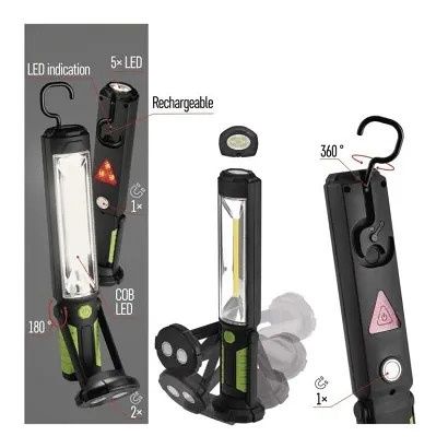 Univerzální plastová nabíjecí pracovní COB LED svítilna, která si najde své místo v každé domácnosti, dílně a všude tam, kde potřebujete zajistit širokou plochu osvětlení.Součástí je i varovný svítící LED trojúhelník, praktický hák a magnet pro zavěšení svítilny a napájecí zdroje do sítě i automobilu.Výhody produktuVysoká svítivost, zadní červené světlo - varovný trojúhelník, napájecí Li-Ion akumulátor, hák a magnet na zavěšení.