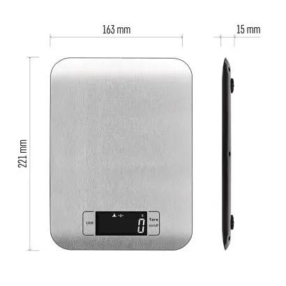 Kuchyňská váha představuje praktický doplňek do každé kuchyně. Své místo si díky stylovému designu jistě najde v každé domácnosti.Výhody produktuElegantní slim design, vážící plocha z nerezu, bílé číslice - dobře viditelné při špatném osvětlení.Váživost do 5 kg, možnost přepnutí jednotky vážení.