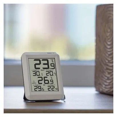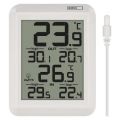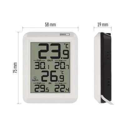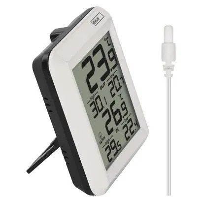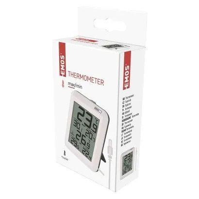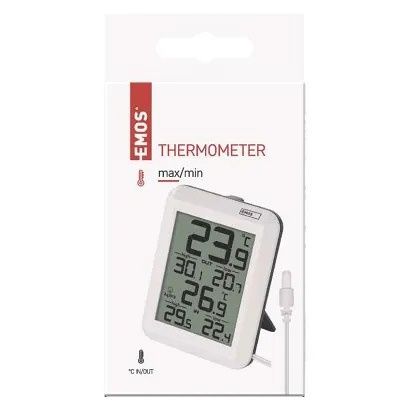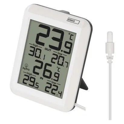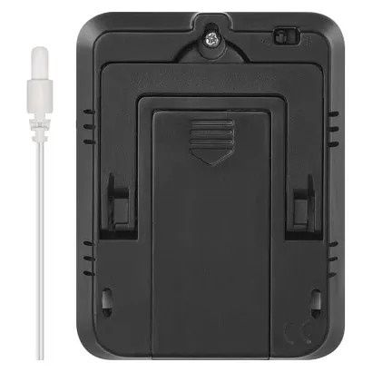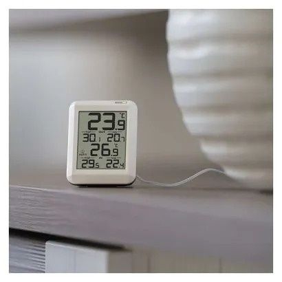 Digitální teploměr s drátovou sondou. Zaznamenává vnitřní a venkovní teplotu, min. a max. teplotu. Sonda má délku 0,9 m.Výhody produktukontinuální zobrazení maximální a minimální teploty a vlhkostiměření a záznam hodnoty tlakuměří vnitřní a venkovní teplotu a vlhkostmožnost pověsit na zeď i postavit na stůlindikace slabých baterií