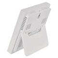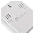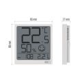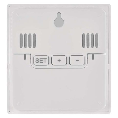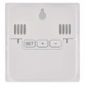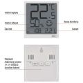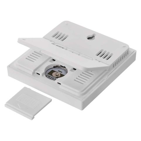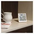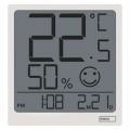 Teploměr v bílé barvě s hodinami řízenými Quarz krystalem. Zobrazuje vnitřní teplotu a vlhkost, hodiny, datum.