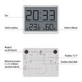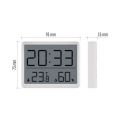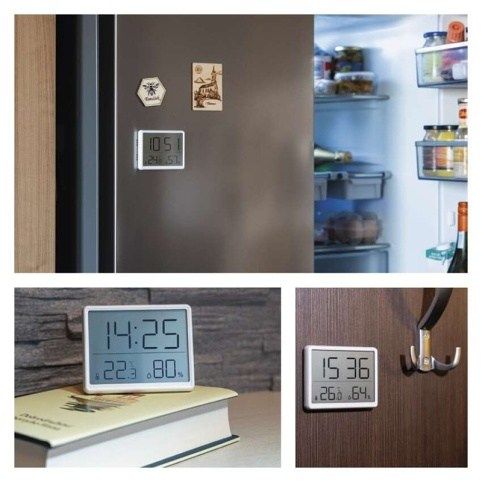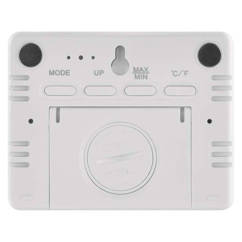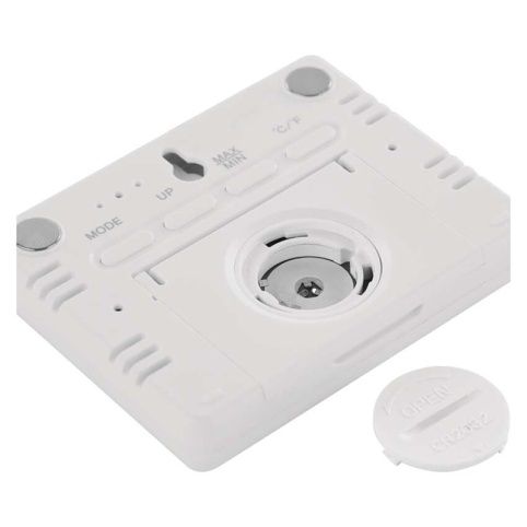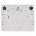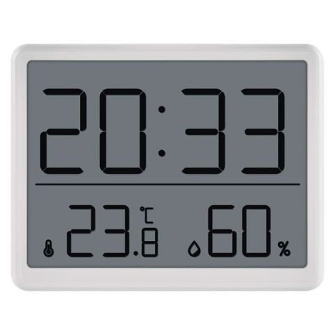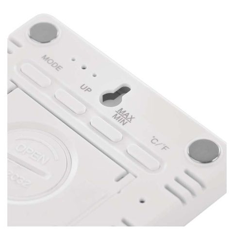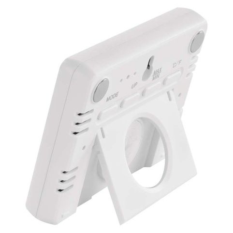 Teploměr v bílé barvě s hodinami řízenými Quarz krystalem. Zobrazuje vnitřní teplotu a vlhkost, hodiny, datum a má budík.