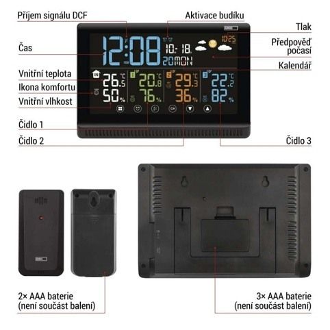 - napájení stanice: 3× 1,5 V AAA (nejsou součástí balení)