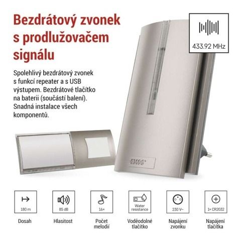 Spolehlivý zvonek s funkcí repeater a USB výstupem, který se hodí nejen k domu, ale i bytu, nebo do kanceláře. Velkou předností tohoto zvonku je jeho bezdrátové provedení.Výhody produktuFunkce repeater – umožňuje prodloužit dosah tlačítka o několik stovek metrů navíc. USB výstup – umožňuje nabíjet 5 V zařízení, pomocí kompatibilního USB kabelu.