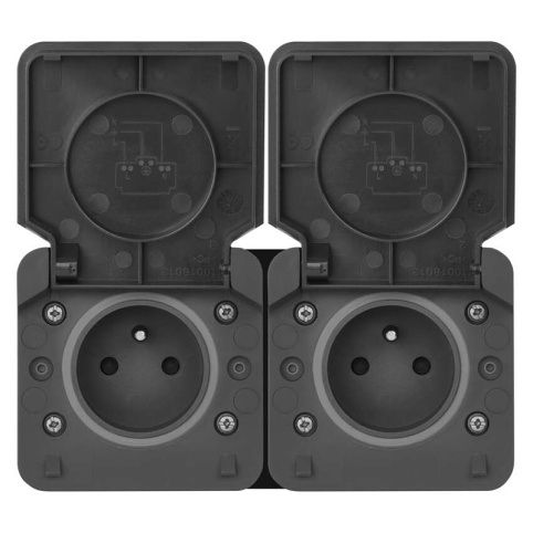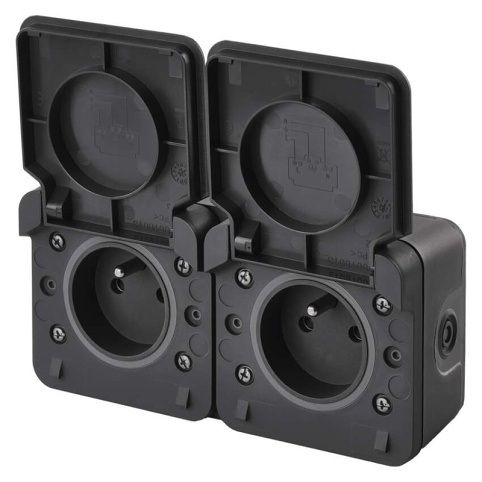 Kvalitní nástěnná voděodolná FRENCH dvojnásobná zásuvka s ochraným víčkem vyrobena ve Francii. Výhody produktuKrytí IP55.