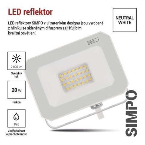 EMOS LED reflektor SIMPO 20W, bílý, IP65, 2000 lm, neutrální bílá