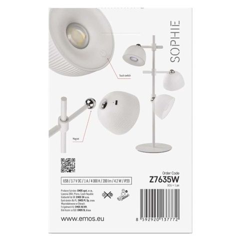 EMOS LED stolní lampa SOPHIE, nabíjecí, bílá