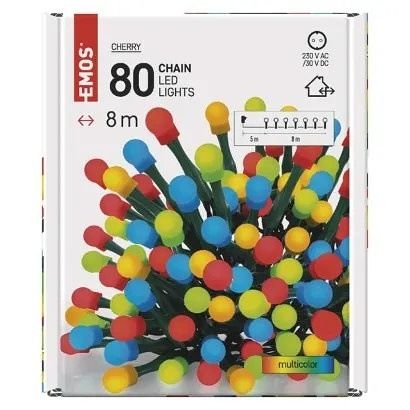 EMOS LED vánoční cherry řetěz – kuličky, 8 m, venkovní i vnitřní, multicolor, časovač