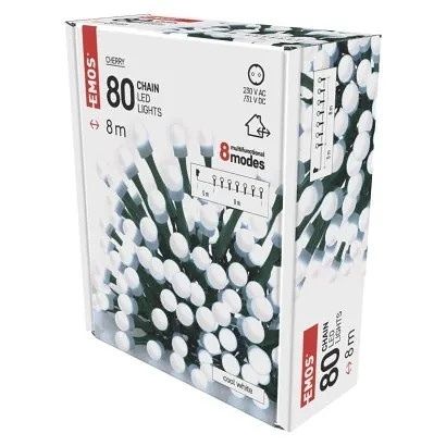 EMOS LED vánoční cherry řetěz – kuličky, 8 m, venkovní i vnitřní, studená bílá,programy,ča