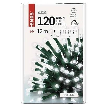EMOS LED vánoční řetěz, 12 m, venkovní i vnitřní, studená bílá, časovač