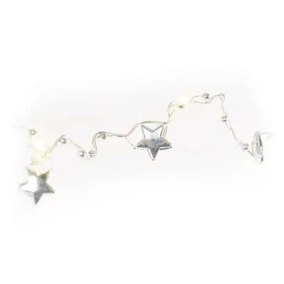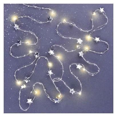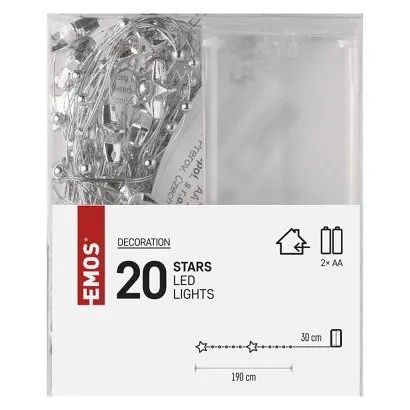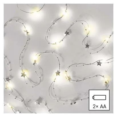 EMOS LED vánoční řetěz stříbrný – hvězdičky, 1,9 m, 2x AA, vnitřní, teplá bílá, časovač
