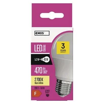 EMOS LED žárovka Classic A60 / E27 / 5,2 W (40 W) / 470 lm / teplá bílá