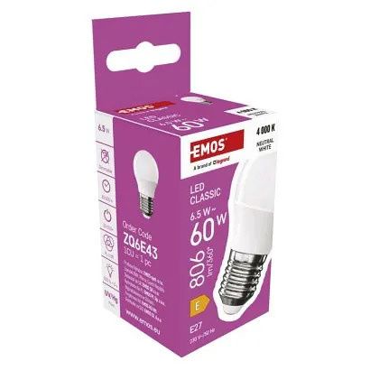 EMOS LED žárovka Classic Mini Globe / E27 / 6,5 W (60 W) / 806 lm / neutrální bílá