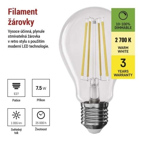 EMOS LED žárovka Filament A60 / E27 / 7,5 W (75 W) / 1 055 lm / teplá bílá / stmívatelná