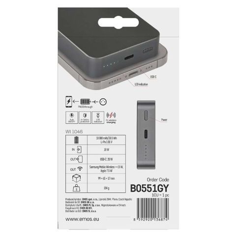EMOS Powerbanka EMOS WI 1046, 10 000 mAh, 20 W+Wireless, šedá