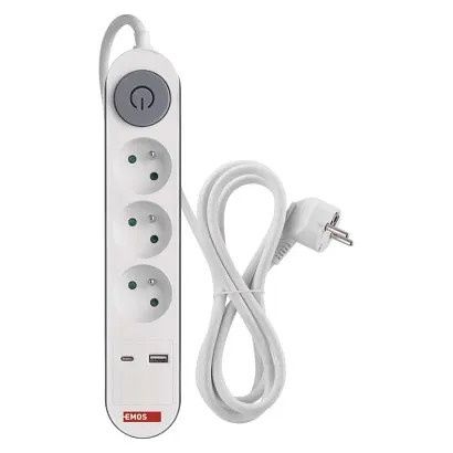 EMOS Prodlužovací kabel 2 m / 3 zásuvky / s vypínačem / bílý / 1×USB-A + 1×USB-C / 1,5 mm2