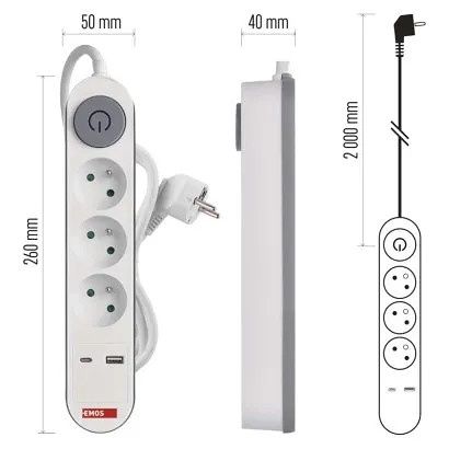 Prodlužovací přívod s vypínačem. 250V~/16A max. 3 zásuvky s dětskými clonkami. USB A+C 3,4 A, 17 W max. Délka přívodního kabelu 2 m. Vodič H05VV-F3G 1,5mm2. Výhody produktuMax. zátěž 3 680 W. USB A/C: 5V DC 3A/15W, 9V DC 2A/18W, 12V DC 1,5A/18W - fast charging-PD (Power Delivery). ?(in total) USB A/C: 3,4A/17 W.