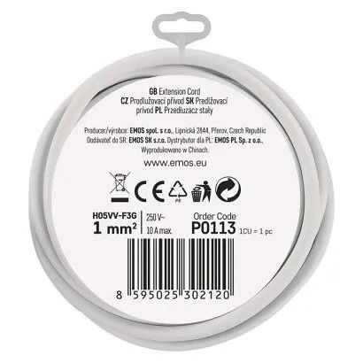 Bílý prodlužovací přívod s jednou zásuvkou - spojka, délkou 3 m a průřezem vodiče 1 mm2. Vhodný pro maximální zátěž 10 A max.Prodlužovací přívod 3 m na 230 V~ slouží k prodloužení elektrické energie tam, kam pevná zásuvka nedosáhne.