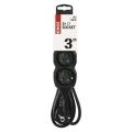 Černý prodlužovací přívod, 3 zásuvka s délkou 3 m a průřezem vodiče 1 mm2. Vhodný pro maximální zátěž 10 A max.Prodlužovací přívod 3 m na 230 V~ slouží k prodloužení elektrické energie tam, kam pevná zásuvka nedosáhne.Při montáži na stěnu je nutné použít vrut se zápustnou hlavou PZ max. průměr 2,5–3 mm, délka 30–40 mm. V případě použití jiného průměru hrozí poškození plastové části otvoru. Pokud dojde k poškození plastové části otvoru, prodlužovací přívod nepoužívejte.