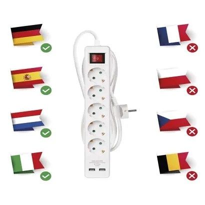 Prodlužovací přívod s vypínačem. 250V~/16A max. 5 zásuvek s dětskými clonkami. 2 x USB 2,1 A max. Délka přívodního kabelu 3 m. Vodič H05VV-F3G 1,5mm2. Výhody produktuMax. zátěž 3 680 W. 2 x USB ? 2,1 A max. (10,5 W).