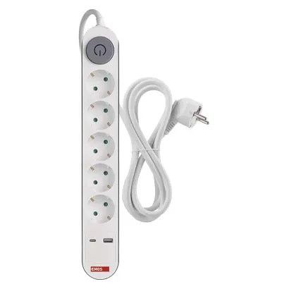 EMOS Prodlužovací kabel 3 m / 5 zásuvky / s vypínačem / bílý / 1× USB-A + 1× USB-C / 1,5 m