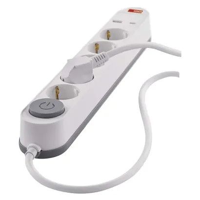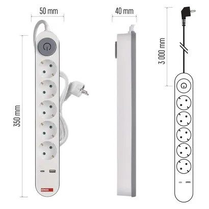Prodlužovací přívod s vypínačem. 250V~/16A max. 5 zásuvek s dětskými clonkami - SCHUKO systém. USB A+C 3,4 A, 17 W max. Délka přívodního kabelu 3 m. Vodič H05VV-F3G 1,5mm2.Výhody produktuMax. zátěž 3 680 W. USB A/C: 5V DC 3A/15W, 9V DC 2A/18W, 12V DC 1,5A/18W - fast charging-PD (Power Delivery). ?(in total) USB A/C: 3,4A/17 W.