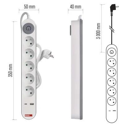 Prodlužovací přívod s vypínačem. 250V~/16A max. 5 zásuvek s dětskými clonkami. USB A+C 3,4 A, 17 W max. Délka přívodního kabelu 3 m. Vodič H05VV-F3G 1,5mm2.Výhody produktuMax. zátěž 3 680 W. USB A/C: 5V DC 3A/15W, 9V DC 2A/18W, 12V DC 1,5A/18W - fast charging-PD (Power Delivery). ?(in total) USB A/C: 3,4A/17 W.