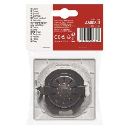 Přístroj stmívače pro regulovatelné LED žárovky, pro otočné ovládání a tlačítkové spínání. Nastavitelná minimální úroveň jasu. Zabudovaná pojistka proti přetížení a zkratu (F1AH). Pro stmívatelné LED žárovky na 230 V AC 3 - 60 W/VA. Pro vakuové a halogenové žárovky na 230 V AC 7-110 W/VA. Pro stmívatelné kompaktní zářivky na 230 V AC 7-110 W/VA. Vestavná hloubka 35 mm.